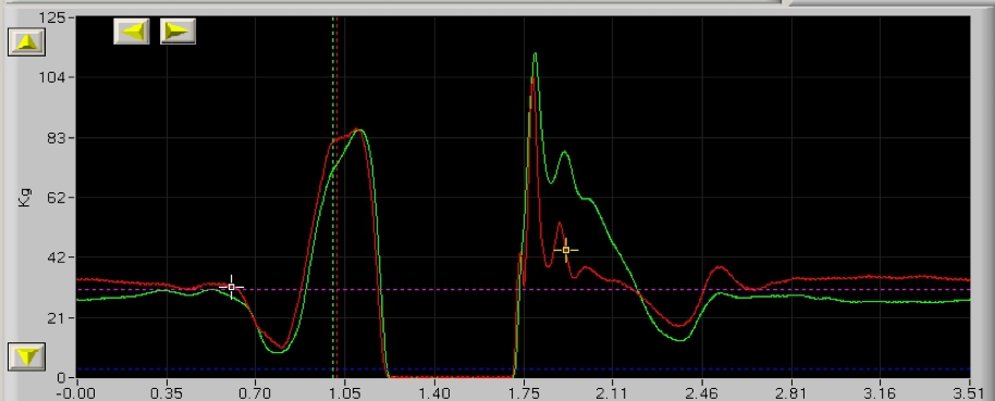 L’immagine evidenzia l’intervento dei due arti, identificabili dal colore rosso e verde, durante la fase di caricamento spinta, volo ed atterraggio da un salto. Con questo test si possono rilevare e valutare eventuali patologie dell’arto inferiore, e valutare il grado di ripresa da un infortunio.